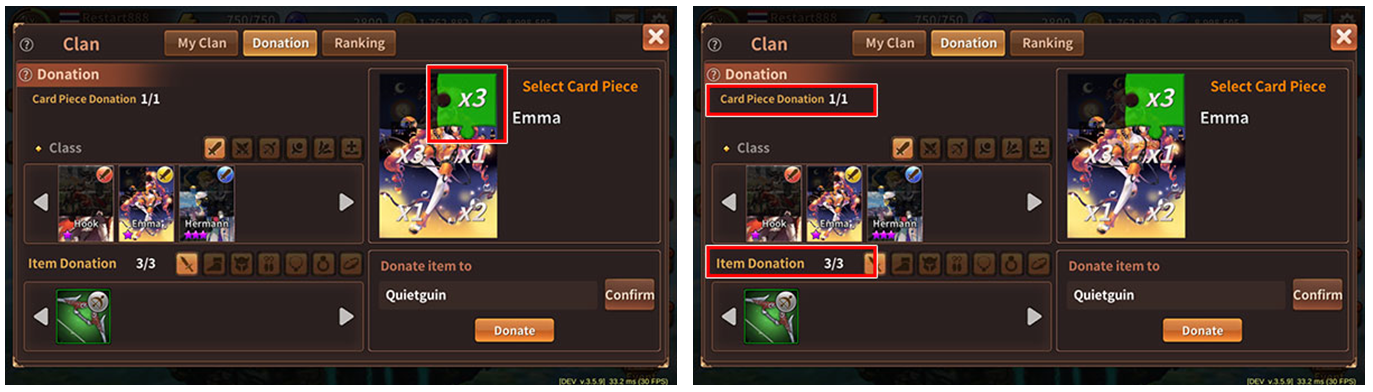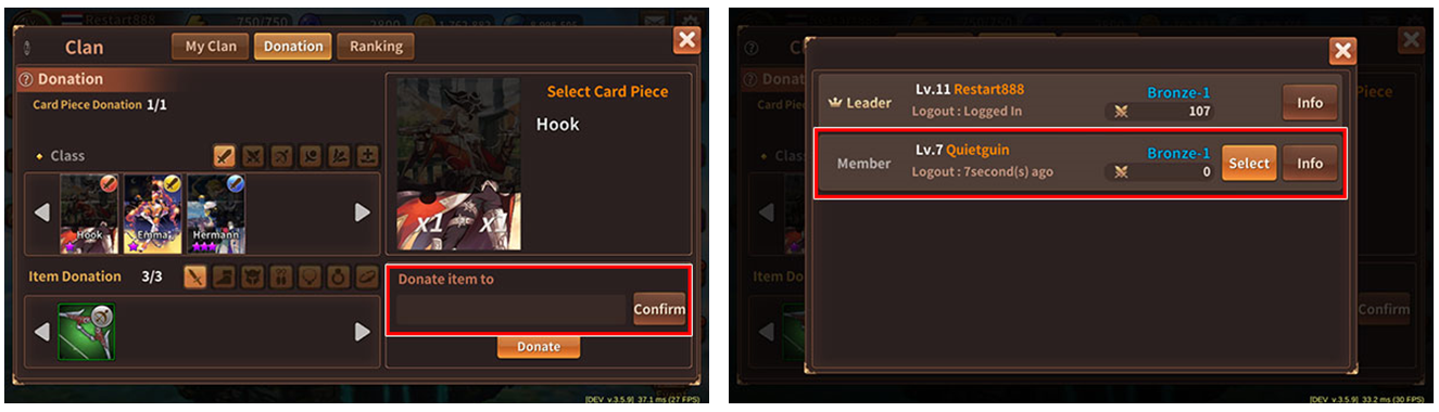 เมื่อเลือกสมาชิกที่ผู้เล่นต้องการบริจาคแล้ว ให้เลือกไอเทมที่ต้องการบริจาคได้จากเมนูด้านซ้าย โดยการบริจาคไอเทมให้เพื่อนในแคลนนั้น มีการจำกัดจำนวนครั้ง จึงต้องคิดให้ดีก่อนการตัดสินใจ