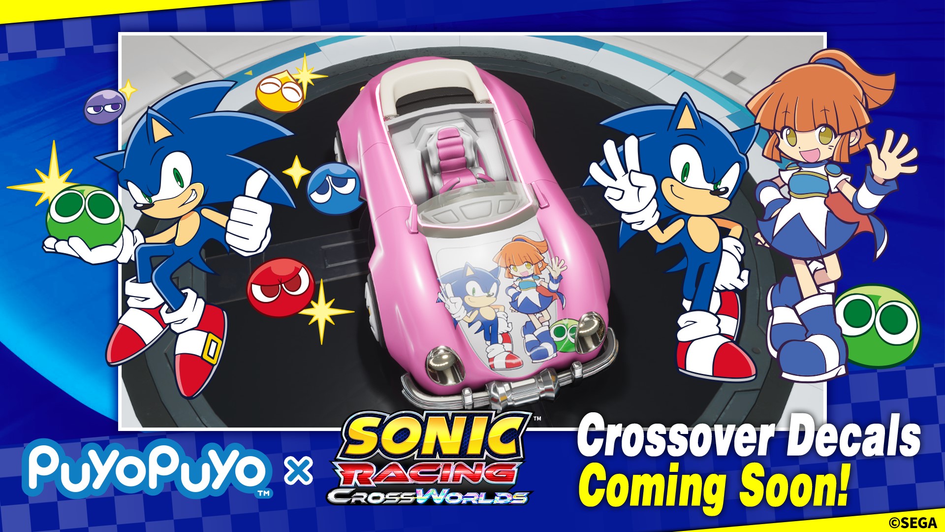 Two decals from the Puyo Puyo puzzle game series, which celebrates its 35th anniversary alongside the Sonic series, are coming to Sonic Racing: CrossWorlds. Customize your machine with them in-game!