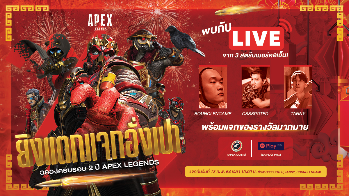 สุขสันต์วันตรุษจีน! เพื่อให้แฟน ๆ ชาวไทยของเราได้ฉลองเทศกาลตรุษจีนอันสำคัญอย่างมีความสุข เกม Apex Legends ภูมิใจเสนอกิจกรรม Lunar New Year Event ตลอดเดือนกุมภาพันธ์นี้ ตั้งแต่วันที่ 12 กุมภาพันธ์เป็นต้นไป ผู้เล่นขาวไทยของเราสามารถเข้าไปรับชมไลฟ์สตรีมจากเหล่าสตรีมเมอร์ชื่อดัง หรือเข้าไปร่วมกิจกรรมได้ทางเพจเกมที่ร่วมกิจกรรมเพื่อรับของรางวัลมากมาย ทั้งเหรียญ Apex Coins และสมาชิก 12 เดือนของ EA Play Pro ได้ฟรีๆ!