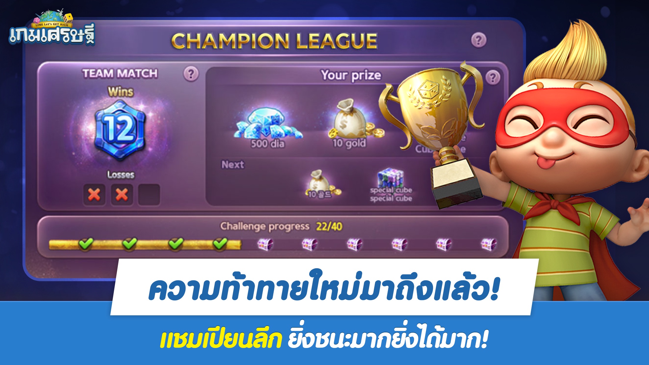 เอาใจสาวกเกมเศรษฐีกับระบบแชมเปี้ยนลีก ท้าทายความสามารถเพื่อนๆ ในระบบด้วยของรางวัลที่เพิ่มขึ้นตามจำนวนครั้งที่ชนะติดต่อกันในเกม ยิ่งชนะมาก ยิ่งได้มาก! เป็นไงล่ะ? เจ๋งใช่มั้ยล่ะ! ใครกำลังร้อนวิชาและต้องการครองกระดานเกมเศรษฐี ห้ามพลาดระบบนี้เด็ดขาด! ความท้าทายครั้งใหม่มาถึงแล้ว! ผู้เล่นที่ลงเล่นระบบแชมเปี้ยนลีกมีโอกาสแพ้ติดต่อกันได้ 3 ครั้งเท่านั้น ซึ่งระบบจะทำการรีเซ็ตทุกสัปดาห์ เมื่อเราสามารถเก็บชัยชนะได้มากเท่าไหร่ของรางวัลก็จะเพิ่มตามขึ้นไปอีกด้วย!