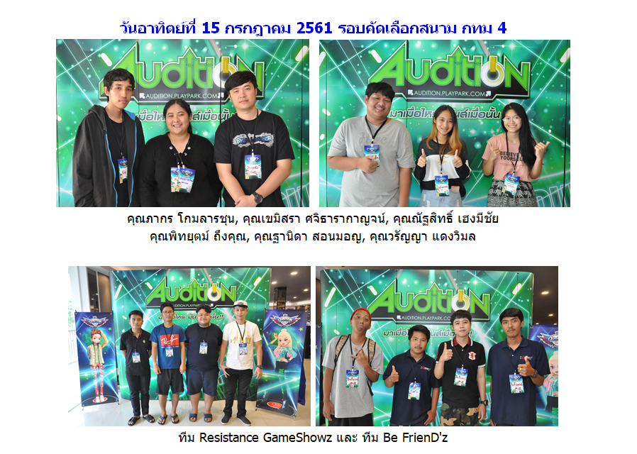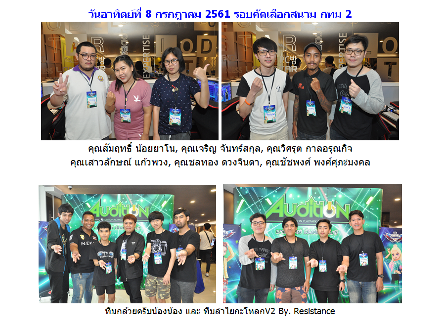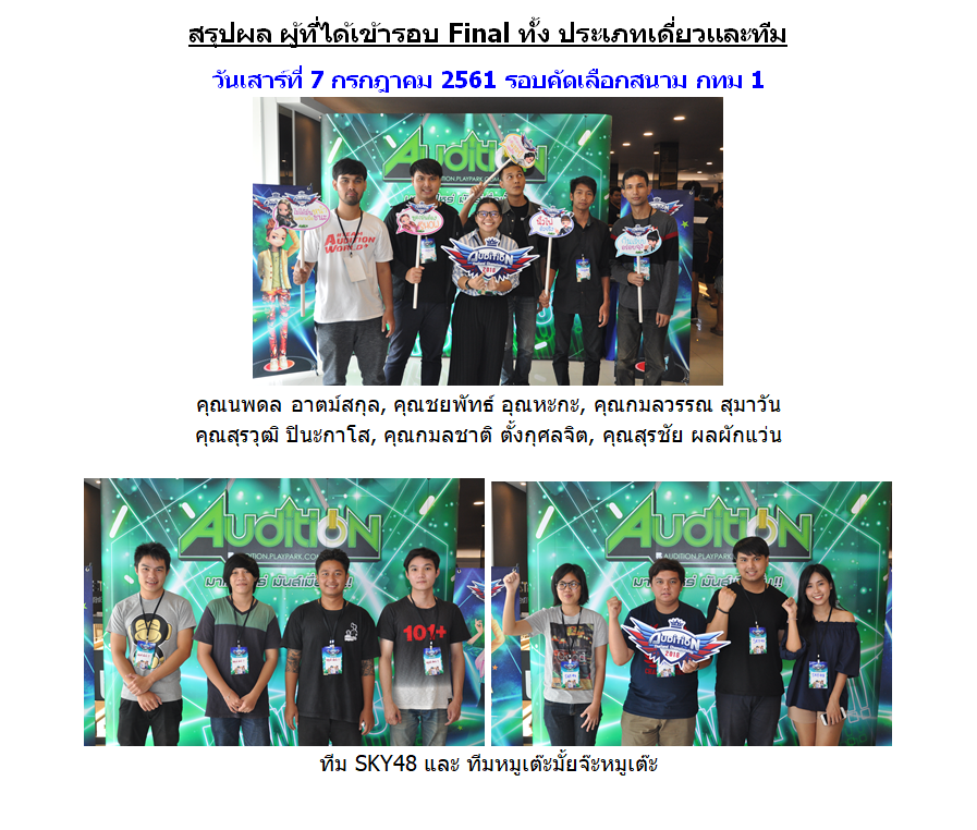 หลังจากที่ AUDITION เกมแดนซ์ออนไลน์สุดฮิตอันดับ 1 ของเมืองไทย จาก PLAYPARK.COM ได้จัดการแข่งขัน AUDITION THAILAND CHAMPIONSHIP 2018 รอบคัดเลือก สนาม กทม. ทั้ง 4 สนาม เมื่อวันเสาร์ - อาทิตย์ ที่ 7 - 8 และ 14 - 15 กรกฎาคมที่ผ่านมา โดยผู้เข้าแข่งขันในปีนี้มีจำนวนมาก ทำให้บรรยากาศในร้าน LODESTAR รามคำแหง 53 ดูแน่นไปด้วยเหล่าขาแดนซ์ที่มาประชันฝีมือเพื่อหาตัวแทนเข้าสู่รอบ Final ระดับประเทศ เพื่อชิงเงินรางวัลรวมกว่า 190,000 บาท ในวันที่ 4 สิงหาคมที่จะถึงนี้ และตอนนี้ก็ได้บทสรุปของผู้ที่ผ่านเข้ารอบ Final เรียบร้อยแล้ว ไปชมโฉมหน้าของผู้ผ่านเข้ารอบกัน!!