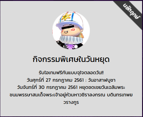 - วันที่ 27 กรกฏาคม 2561 จัดกิจกรรมในเวลา 17.00-18.00 น.