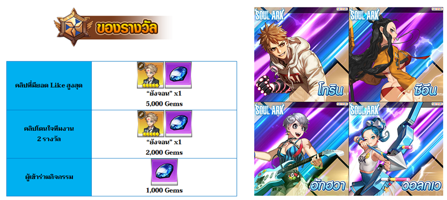 - คลิปที่ได้รับยอด Like สูงสุด จะได้รับรางวัล “ยังจอน ” และ “5,000 Gems”