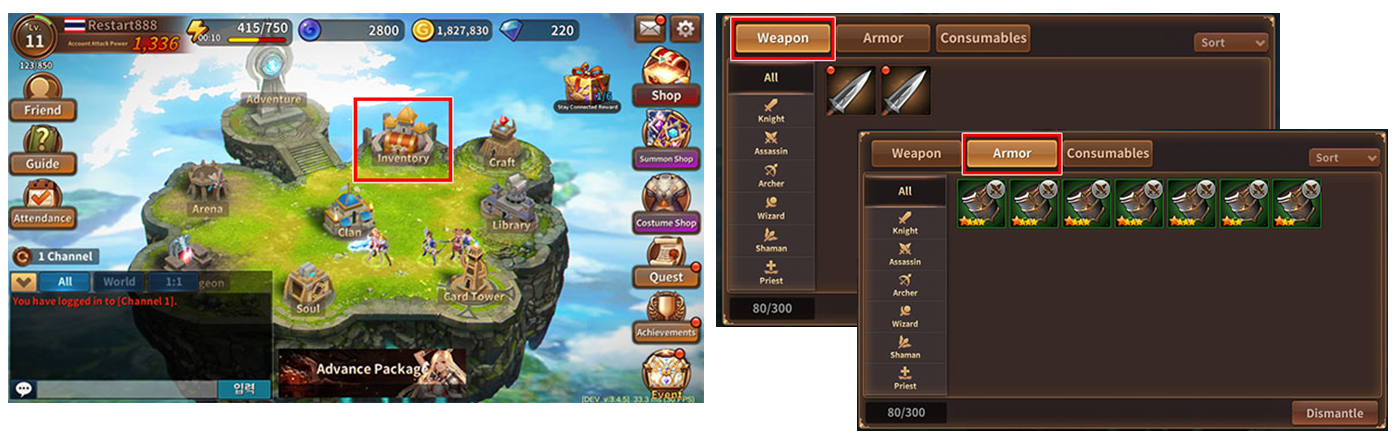 ขั้นแรกให้ผู้เล่นเข้าไปตรวจสอบอุปกรณ์ทั้งหมดที่ฟังชั่น “Inventory” หรือ “คลัง” โดยที่อุปกรณ์จะแยกเป็น 2 ประเภท คืออาวุธและชุดเกราะ และยังแบ่งแยกตามอาชีพต่างๆทั้งหมด 6 อาชีพอีกด้วย