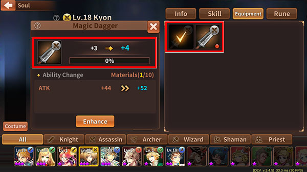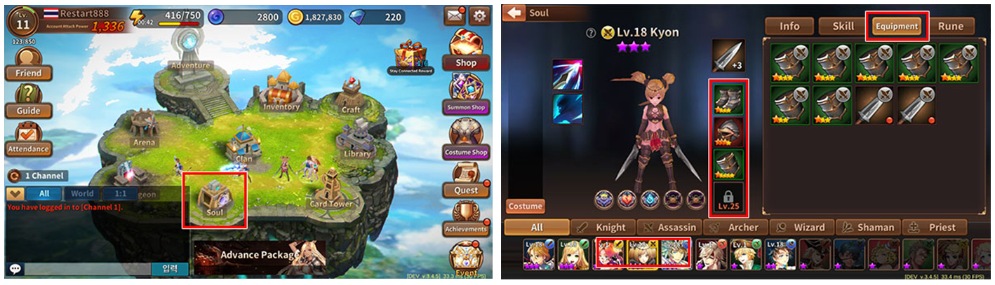 อีกวิธีคือเข้าไปเช็คที่ฟังก์ชั่น “Soul” ในหน้าจัดการตัวละคร โดยสามารถเลือกที่ไปเมนู “Equipment” หรือ “อุปกรณ์” โดยในหน้านี้จะแสดงเฉพาะอุปกรณ์ที่เกี่ยวข้องกับอาชีพของผู้เล่นเท่านั้น ในหมวดชุดเกราะ สามารถใส่ได้ 4 ชิ้นที่ไม่ซ้ำกัน ซึ่งประกอบไปด้วย หมวก, รองเท้า, ปลอกแขน และเครื่องประดับ