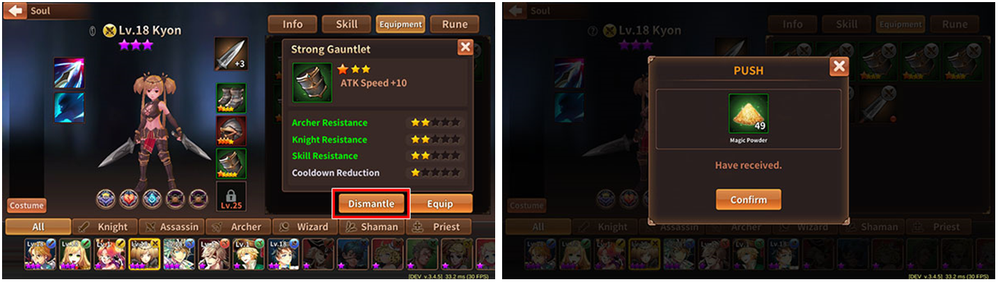 ในส่วนของอุปกรณ์จะไม่สามารถอัพเกรดได้ แต่ถ้ามีอุปกรณ์ที่ไม่ใช้งานสามารถนำมาแยกชิ้นส่วน โดยเมื่อแยกชิ้นส่วนก็จะได้รับ “Magic Powder” จำนวนหนึ่ง