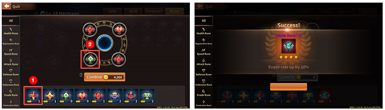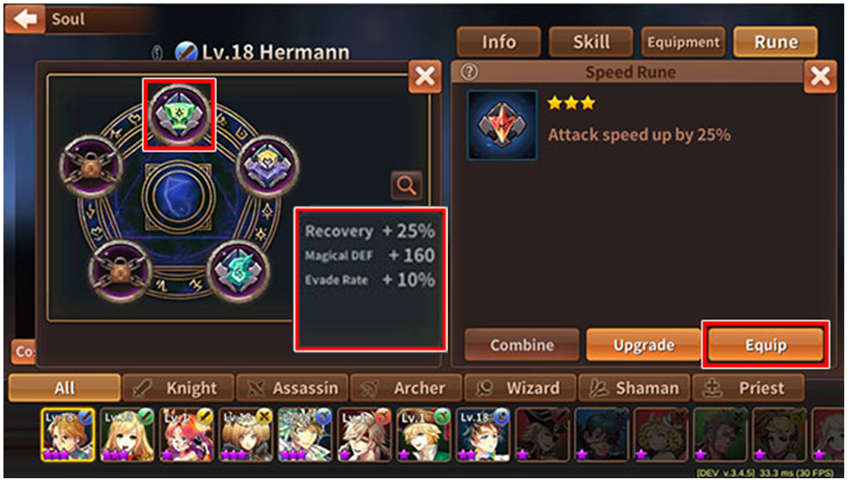 จากนั้นคลิ๊กที่รูนและกดปุ่ม Equip หลังจากนั้นเลือกช่องรูน (ด้านซ้าย) ที่ว่างอยู่ (หากในช่องนั้นมีรูนกำลังสวมใส่อยู่จะไม่สามารถคลิกได้) ที่ช่องด้านข้างจะแสดงผลลัพธ์ของรูนทั้งหมดที่กำลังสวมใส่อยู่ รูนที่ออฟชั่นเหมือนกันไม่สามารถใส่ซ้ำกันได้ และเมื่อผู้เล่นอัพเกรดระดับดาวของตัวละคร ก็จะปลดล็อคช่องรูนเพิ่มได้ ซึ่งจะมีได้สูงสุด 5 ช่องเท่านั้น