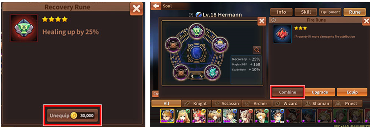 หากต้องการเปลี่ยนหรือถอดรูนจากตัวละคร สามารถใช้ Gold จำนวนหนึ่งในการถอด นอกจากนี้ยังสามารถผสมรูนได้ด้วยการกดที่ปุ่ม Combine