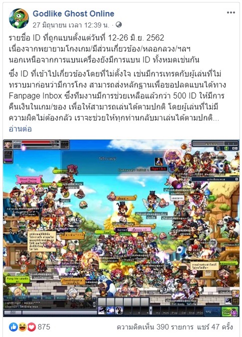 โดยล่าสุดเมื่อวันที่ 27 มิถุนายน ที่ผ่านมา ทางทีมงานเกม Ghost Online ได้ออกมาประกาศรายชื่อไอดีที่ถูกแบนกว่า 1000 ไอดี ซึ่งเป็นการทั้งแบนไอดี และแบนฮาร์ดแวร์ไอดี (สามารถดูรายละเอียดได้ที่ : https://f.ls/ZFxaF) ทำเอาผู้เล่นในเกมที่เล่นอย่างถูกต้องจำนวนมากต่างมาแสดงความดีใจพร้อมกด Like พร้อมยกย่องทีมงานในความขยัน และเอาจริงเรื่องแบนคนโกง