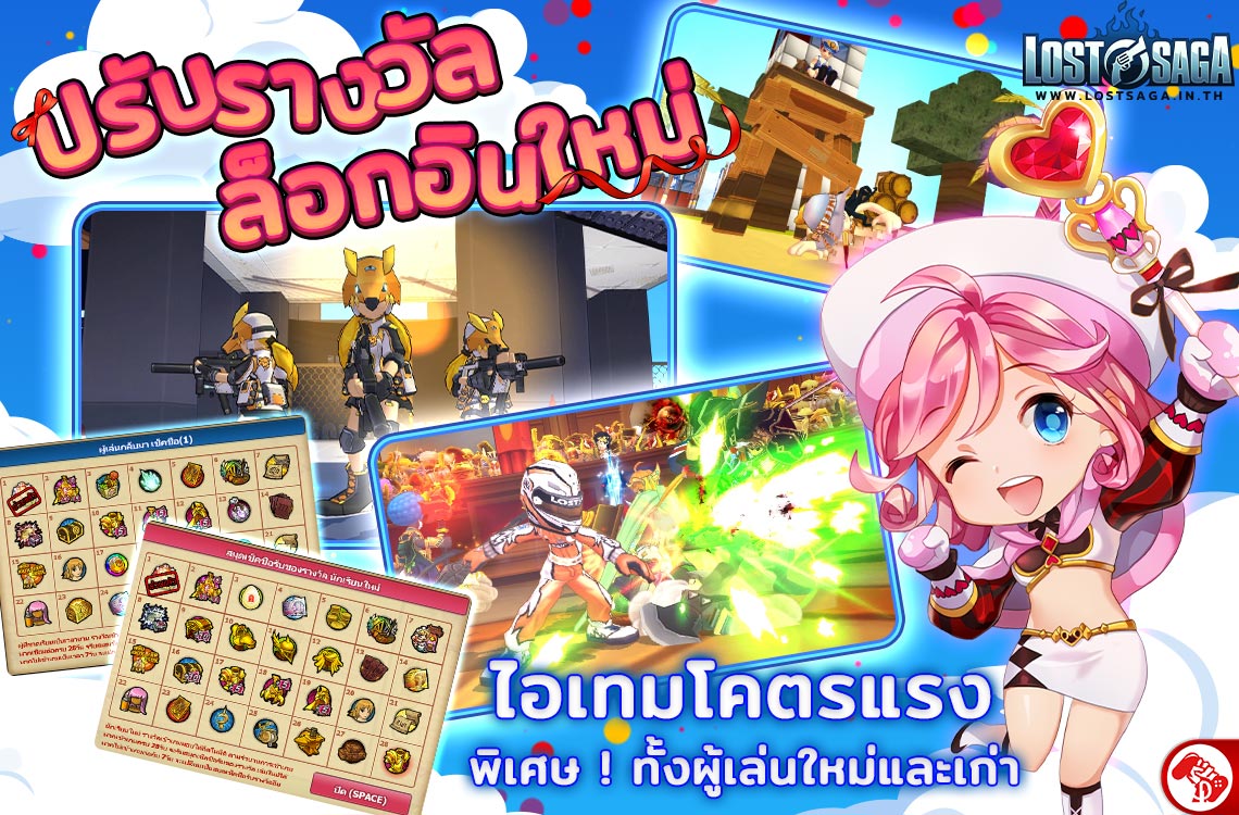 ในส่วนของผู้เล่นใหม่ ต้องบอกเลยว่ารายการรางวัลที่อัปเดตใหม่นั้นดีขึ้นกว่าเดิมมากๆ ซึ่งหากล็อกอินถึงวันที่ 7 จะได้แพ็กเกจตัวละครพร้อมตกแต่ง และหากล็อกอินครบทั้ง 28 วัน จะได้รับของรางวัลสุดแรร์ อาทิ “ใบสุ่มแรร์ฮีโร่ถาวร และกล่องสุ่มเกียร์ถาวร” ด้วยไอเทมเหล่านี้จะช่วยให้ผู้เล่นสามารถสนุกไปกับกเกม Lost Saga ได้ง่ายกว่าเดิม เพราะไอเทมที่ได้รับจะครบเครื่อง ทั้ง ตัวละครและเกียร์แบบถาวร ใบเพิ่มค่าประสบการณ์ จะช่วยให้เพื่อนๆ ตามไปทันผู้เล่นปัจจุบันอย่างแน่นอน !