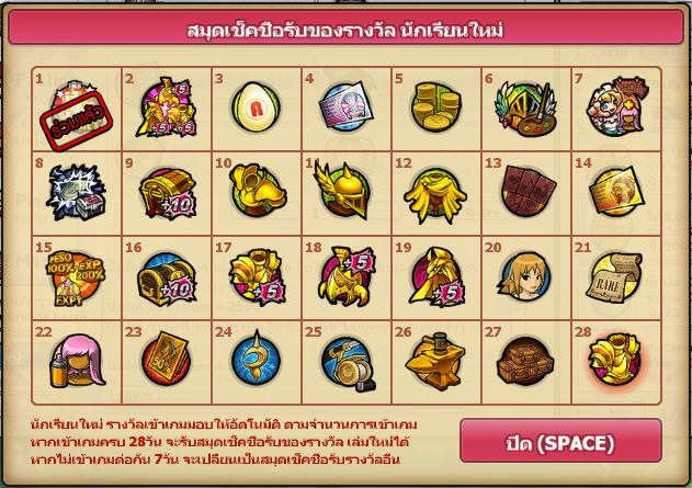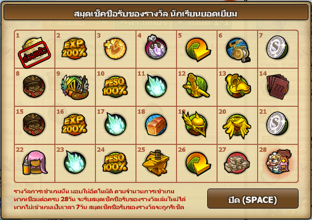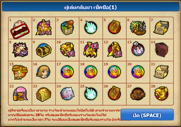 ***ทั้งนี้ สำหรับตารางสมุดเช็คชื่อล็อกอินของผู้เล่นใหม่ และผู้เล่นที่กลับมา หลังจากล็อกอินรับไอเทมครบทั้ง 28 วัน ระบบจะเปลี่ยนตารางล็อกอินมาเป็นผู้เล่นปัจจุบันแทน***