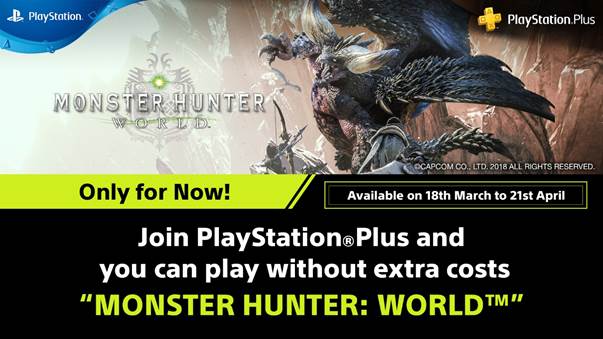 5 สัปดาห์ตั้งแต่วันที่ 18 มีนาคม - 21 เมษายน ศกนี้ สมาชิก PS Plus สามารถดาวน์โหลดเกม Monster Hunter: World™ ฟรี! บนช่องทาง PS Store ข้อเสนอนี้รวมไปถึงสมาชิก PS Plus ใหม่ที่สมัครในช่วงเวลากิจกรรม เพื่อให้คุณได้เพลิดเพลินกับไปเกมต่างๆ ฟรี เฉพาะสำหรับสมาชิก PS Plus เท่านั้น