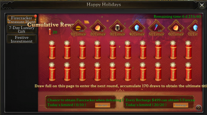 จุดประกายความมันส์: ร่วมเฉลิมฉลองด้วยรางวัลระเบิดความมันส์ในกิจกรรม Firecracker: Ignites the Firework! ผู้เล่นสามารถสะสม Firecracker ได้จากการกำจัดบอส และเติมเงินตามเงื่อนไข เพื่อนำไปจุดพลุและรับรางวัลพิเศษ! เคล็ดลับ: จุดมาก ยิ่งได้มาก!