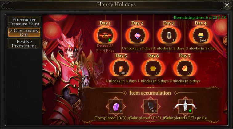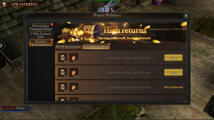 ลงทุนน้อย ได้คืนมาก: เฉลิมฉลองฤดูกาลแห่งความสุขกับกิจกรรม Festive Investment รับรางวัลที่เพิ่มขึ้นตามความทุ่มเทของคุณ! กิจกรรมมาพร้อมกับระดับการลงทุน 2 แบบ คือ $9.99 และ $24.99 โดยหลังจากเติมเงินในระดับที่เลือกแล้ว ผู้เล่นจะสามารถรับรางวัลตามจำนวนวันที่ล็อกอิน (ทุกๆ 5 วันในช่วงกิจกรรม) ยิ่งล็อกอินติดต่อกันมากเท่าไร รางวัลยิ่งมากขึ้น!