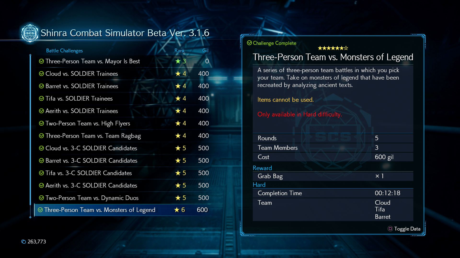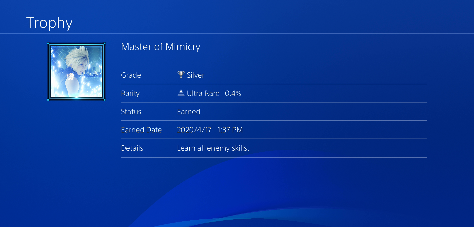 โดยถ้วยนี้จะได้จากการที่เราปราบเจ้า Malboro ใน Battle Challenge ผ่านห้องจำลองการต่อสู้ของบริษัทชินระ ที่บริเวณห้องทดลองของ Hojo ในช่วงต้นของ Chapter 17 ซึ่งเควสนี้จะมีแค่ในระดับ Hard Mode เท่านั้น เราจำเป็นจะต้องจบเกมก่อนเพื่อปลดล๊อค Hard Mode ถึงจะสามารถมาทำ Battle Challenge อันนี้ได้ครับ