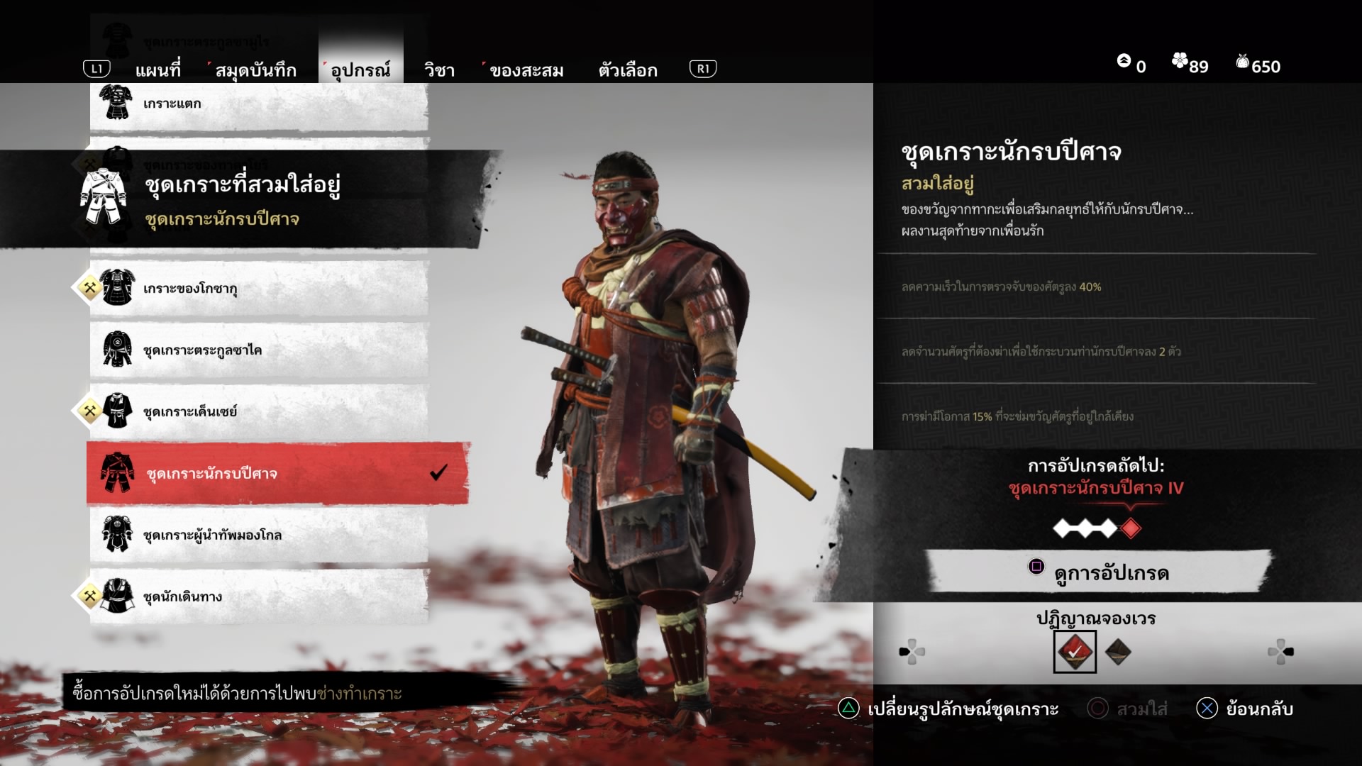 ในตอนแรกเราจะได้ชุดเกราะแตกมาใส่ก่อนต่อมาก็จะเป็นชุดนักเดินทาง แอดแนะนำว่ายังไม่ต้องอัพเกรดเพราะว่าเล่นไปอีกสักพักก็จะได้ ชุดเกราะตระกูลซามูไร มาใส่โดย ชุดเกราะตระกูลซามูไร จะบวกพลังป้องกันและเพิ่มเลือดอย่างมากทำให้เราต่อสู้กับเหล่าศัตรูได้นานขึ้น พอไปถึงกลางๆเกมค่อยเปลี่ยนเกราะก็ยังทันเพราะช่วงกลางเกมถึงท้ายเกม เกราะแต่ละเกราะจะมีความสามารถเฉพาะตัวไม่ว่าจะเป็น เมื่อฆ่าศัตรูแล้วเลือดจะเพิ่ม, สามารถประจัญหน้าได้สูงสุด 5 คน, สายนักฆ่า เรียกได้ว่าสามารถปรับเปลี่ยนการเล่นได้ตลอดเวลา