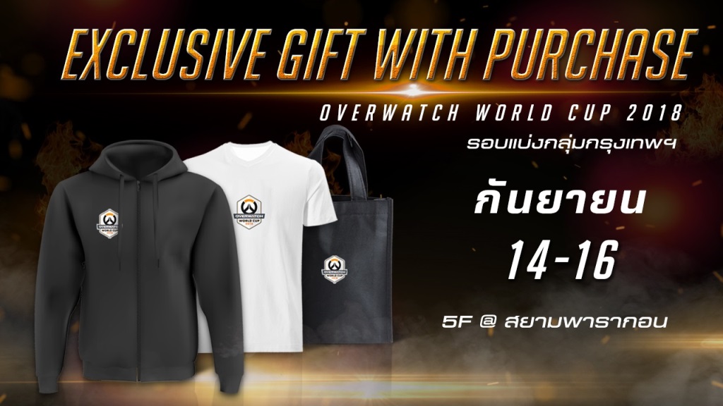 - ซื้อสินค้ารวมมูลค่ามากกว่า 4,500 บาท: รับถุงผ้า Overwatch World Cup 2018 หนึ่งใบ และเสื้อยืด Overwatch World Cup 2018 หนึ่งตัว