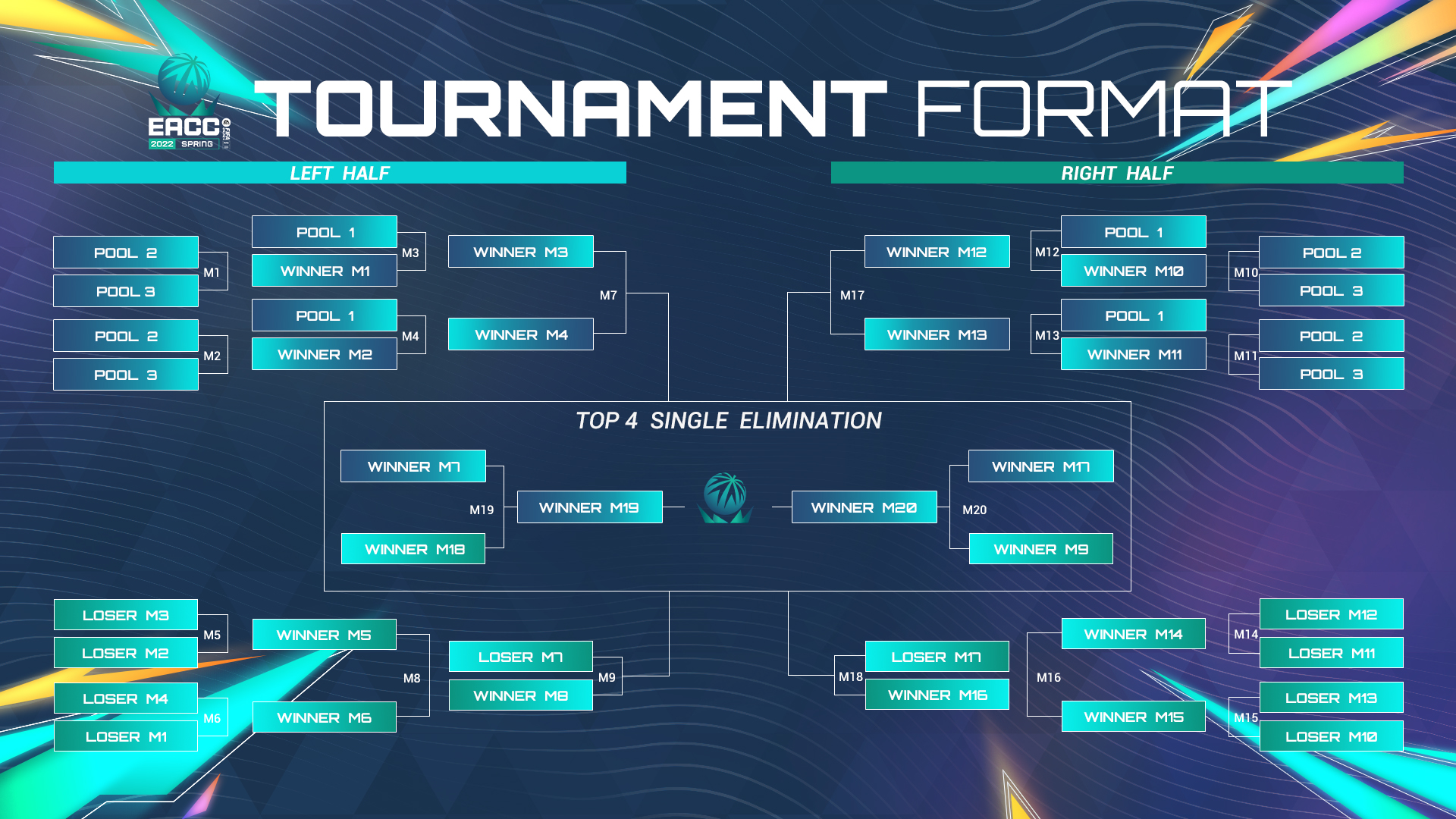 EACC Spring 2022 มาพร้อมกับรูปแบบใหม่ในปีนี้ สามทีมจากแต่ละประเทศที่เข้าร่วม – จีน, เกาหลี, ไทย และเวียดนาม – แต่ละทีมประกอบด้วยผู้เล่นสามถึงสี่คน จะแข่งขันกันในรูปแบบสองด้านแบบคัดออกสองด้าน ในระหว่างการแข่งขันแบบแพ้คัดออกคู่นี้ การแข่งขันแต่ละครั้งจะเล่นในรูปแบบ Best-of-5 ซึ่งหมายความว่าทีมจะต้องชนะอย่างน้อยสามเกมจากทั้งหมดห้าเกมที่เล่นเพื่อผ่านเข้ารอบ