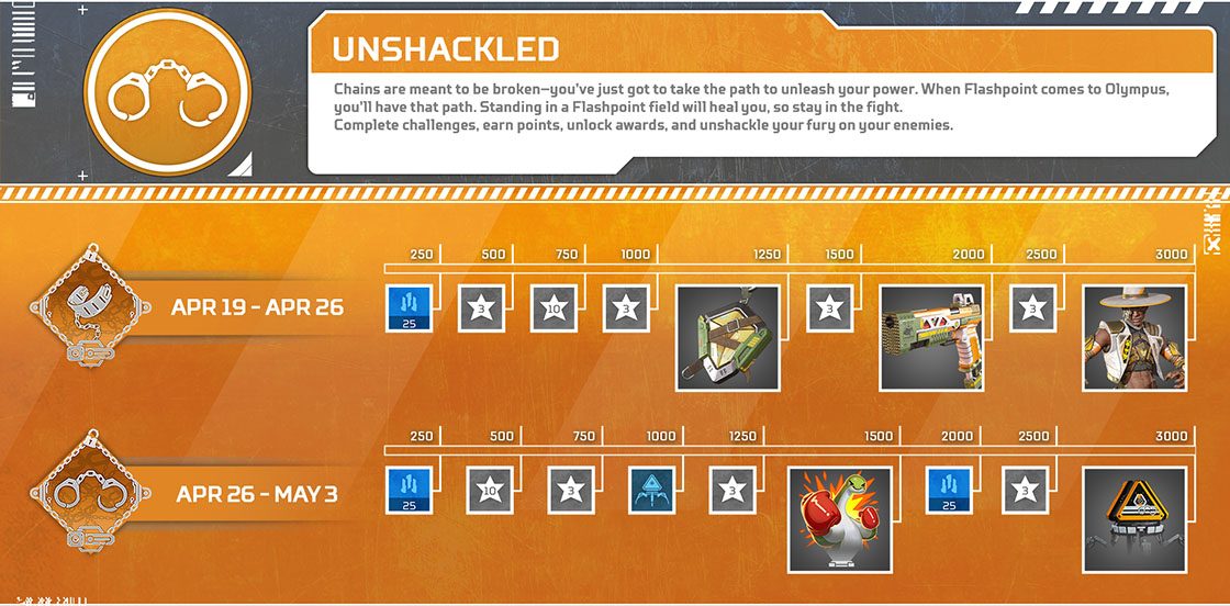 Apex Legends เปิดตัวอีเว้นท์ Unshackled ที่จะมีสกินลิมิเต็ดหลายๆ ตัว และยังจะนำโหมดที่เราเคยได้เล่นกันไปแล้วอย่าง Flashpoint กลับมาให้เล่นอีกด้วย โดยการกลับมาครั้งนี้ของ Flashpoint เราจะได้เล่นกันที่แผนที่ Olympus นั้นเอง Unshackled จะปล่อยให้เราได้เล่นกันวันที่ 19 เมษายนนี้
