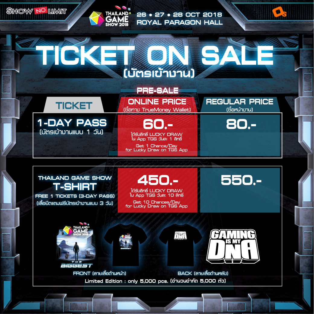 - เสื้อ 1 ตัว แถมฟรี! บัตรเข้างานแบบ 3 วัน ราคา 450 บาท ได้รับสิทธิ์ลุ้นรางวัลกับกิจกรรม TGS EVERYDAY ในแอป THAILAND GAME SHOW วันละ 10 สิทธิ์