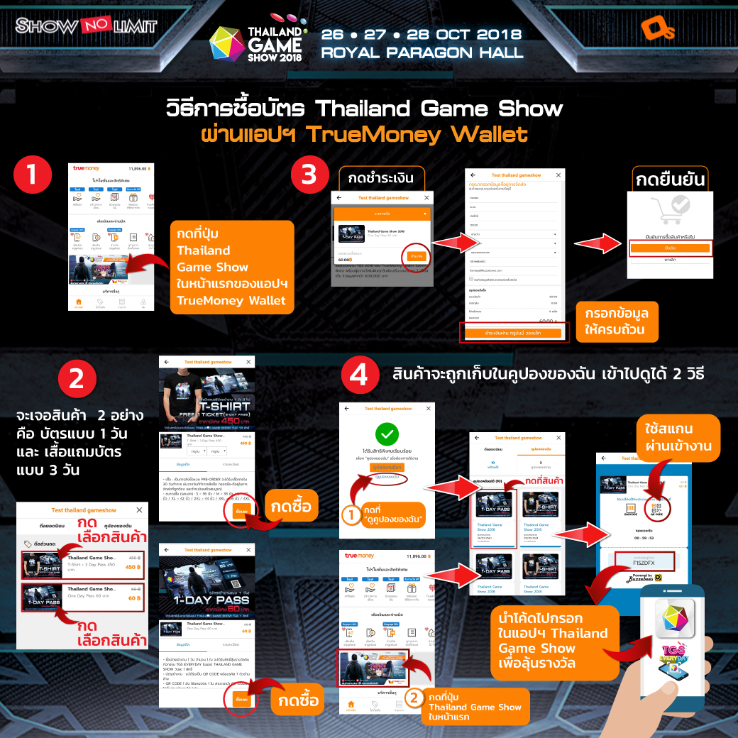 - ซื้อเสื้อหรือบัตร THAILAND GAME SHOW 2018 ล่วงหน้าผ่านทางแอปฯ TrueMoney Wallet