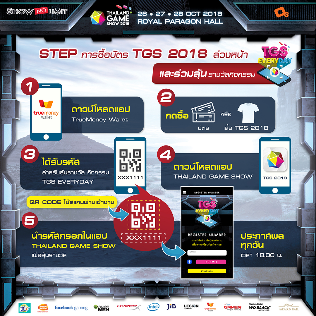 เตรียมระเบิดความมันอีกครั้งกับมหกรรมงานเกมสุดยิ่งใหญ่แห่งเอเชียตะวันออกเฉียงใต้ THAILAND GAME SHOW 2018 ในวันที่ 26-27-28 ตุลาคม 2561 ที่รอยัล พารากอน ฮอลล์ ชั้น 5 สยามพารากอน ตลอด 3 วันเต็ม ภายใต้คอนเซ็ปต์ "THE BIGGEST" จัดเต็มความมันและความยิ่งใหญ่มากกว่าทุกปี พร้อมกิจกรรม TGS EVERYDAY ลุ้นรางวัลรวมมูลค่ากว่า 600,000 บาท เมื่อซื้อบัตรเข้างานล่วงหน้าผ่านทาง TrueMoney Wallet ตั้งแต่วันนี้เป็นต้นไป