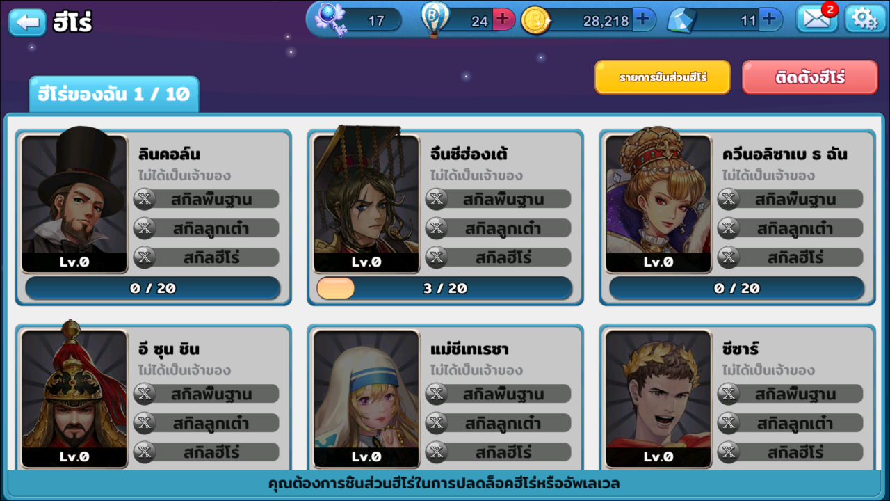 - สามารถสะสมชิ้นส่วนเพื่อปลดล็อคฮีโร่ หรือ อัพเลเวลได้ทุกตัว