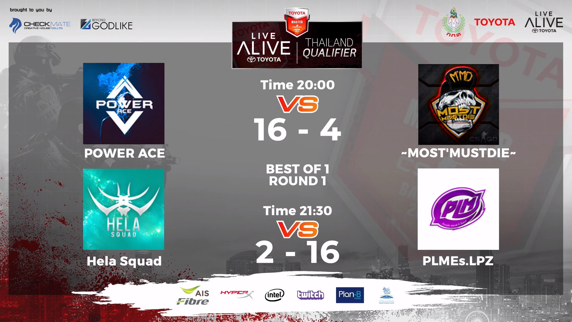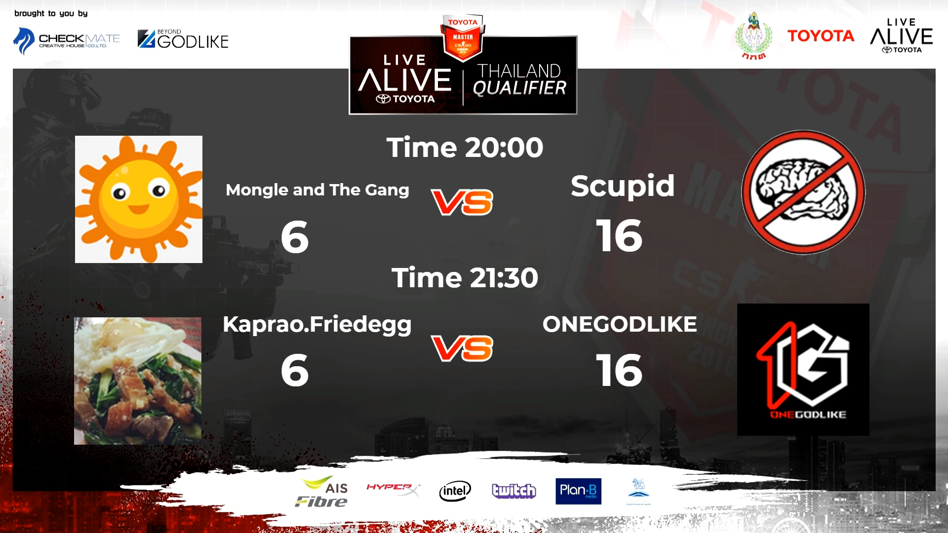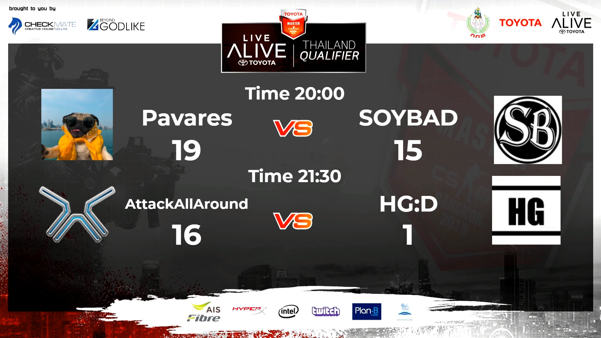 จากการแข่งขัน Counter Strike Global Offensive หรือ CS:GO ในรายการ TOYOTA MASTER CS:GO BANGKOK 2018 โดยในรอบนี้เป็นการค้นหาตัวแทนทีมไทยที่จะเข้าไปเจอกับทีมระดับโลกต่างๆนาๆ ซึ่ง TOYOTA LIVE ALIVE Thailand Qualifier ตอนนี้อยู่ในช่วงการคัดจาก 32 ทีมให้เหลือ 16 ทีมและมาแข่งต่อในรอบ LAN ที่ E-Sport Arena พันธุ์ทิพย์พลาซ่า ประตูน้ำ ในวันที่ 10 และ 11 พฤศจิกายน ต่อไป