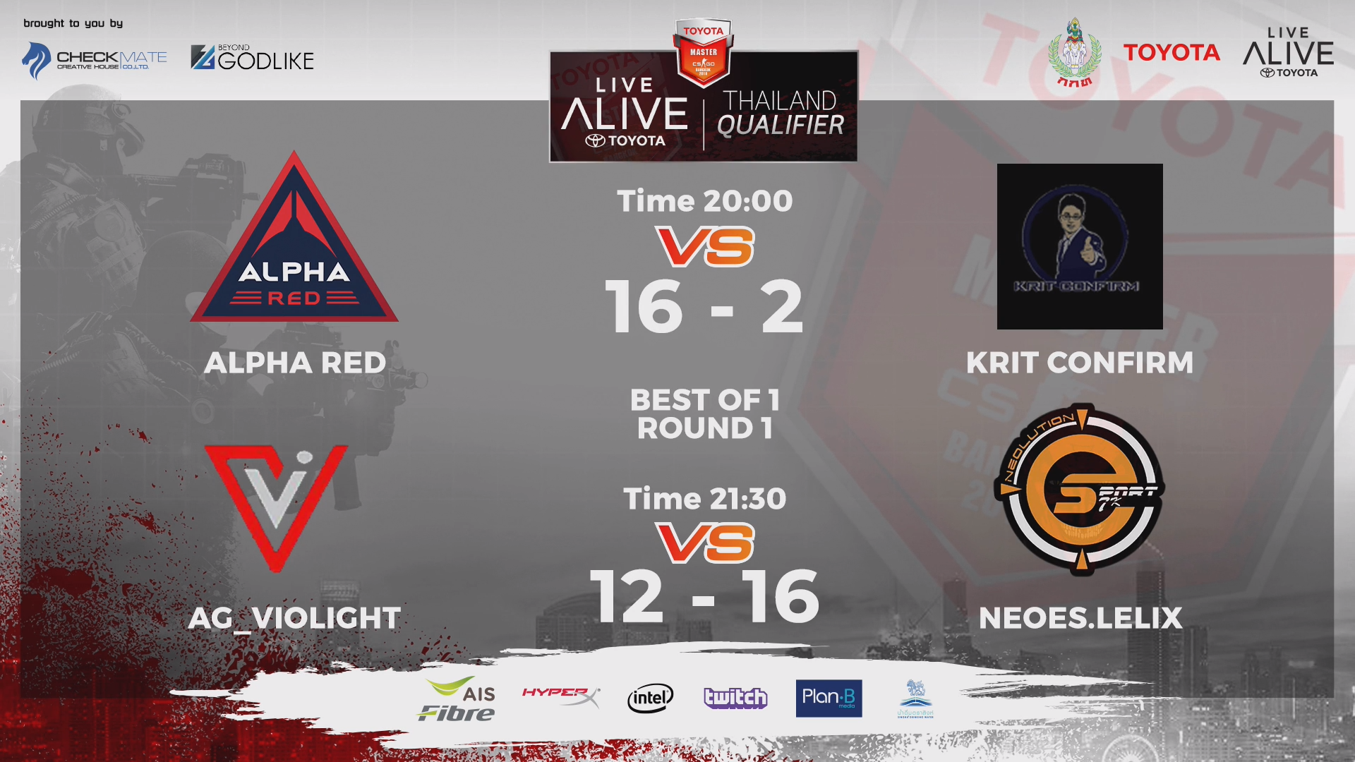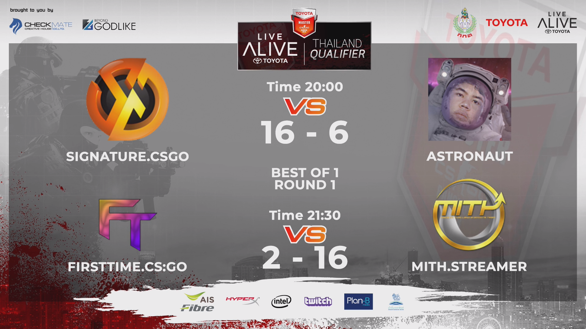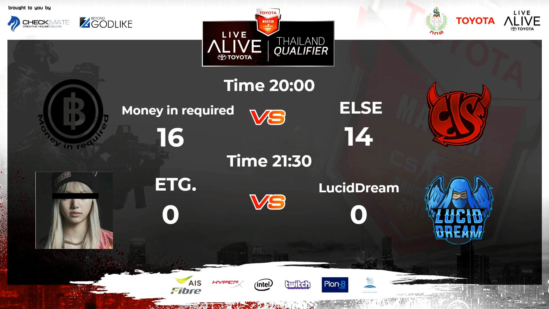 จากการแข่งขัน Counter Strike Global Offensive หรือ CS:GO ในรายการ TOYOTA MASTER CS:GO BANGKOK 2018 โดยในรอบนี้เป็นการค้นหาตัวแทนทีมไทยที่จะเข้าไปเจอกับทีมระดับโลกต่างๆนาๆ ซึ่ง TOYOTA LIVE ALIVE Thailand Qualifier ตอนนี้อยู่ในช่วงการคัดจาก 32 ทีมให้เหลือ 16 ทีมและมาแข่งต่อในรอบ LAN ที่ E-Sport Arena พันธุ์ทิพย์พลาซ่า ประตูน้ำ ในวันที่ 10 และ 11 พฤศจิกายน ต่อไป