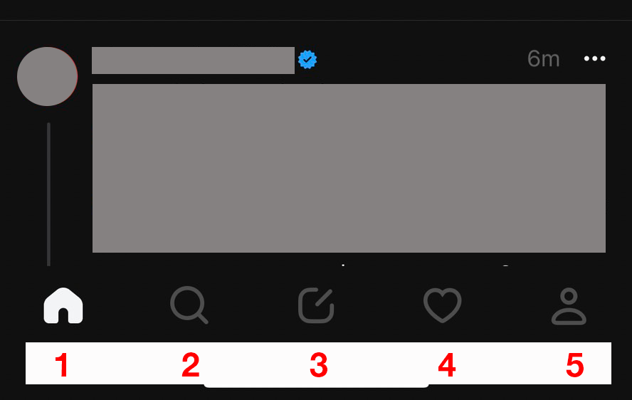 ตำแหน่งหมายเลข 5 เป็นหน้าโปรไฟล์ของเรา จะแสดงรูปโปรไฟล์ ประวัติโดยย่อ และผู้ติดตาม รวมไปถึงแสดงโพสต์ และการตอบกลับ (Replies) ของเราทั้งหมด