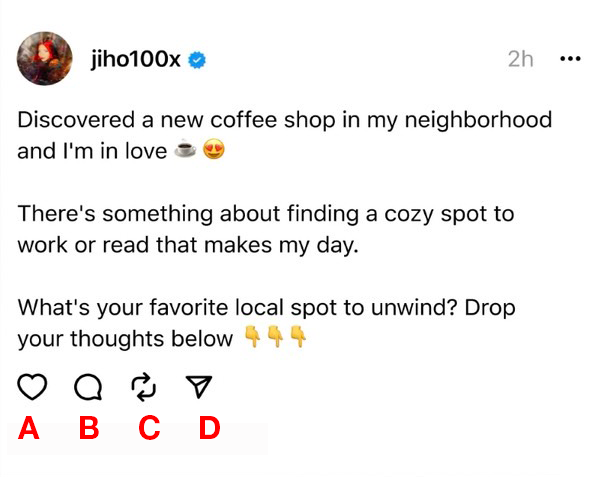 ตำแหน่ง A เป็นการกด Like เหมือนของ Instagram ไม่เหมือน Twitter ที่จะมีหมวดแยกให้เราดูว่า Like อะไรไปแล้วบ้าง สำหรับ Threads การ Like เป็นการแสดงความรู้สึกเท่านั้น