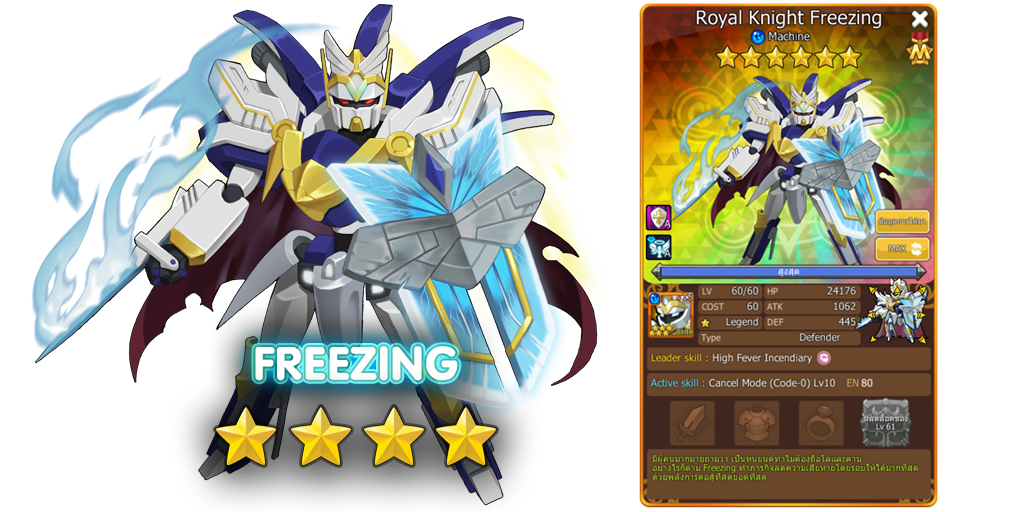 Leader Skill (6 ดาว) : High Fever Incendiary - เพิ่มพลังป้องกันของ Creatures ของพวกเราทั้งหมด 20% + Max HP ของเผ่า Machine ฝ่ายเราทั้งหมดเพิ่มขึ้น 3,000 หน่วย