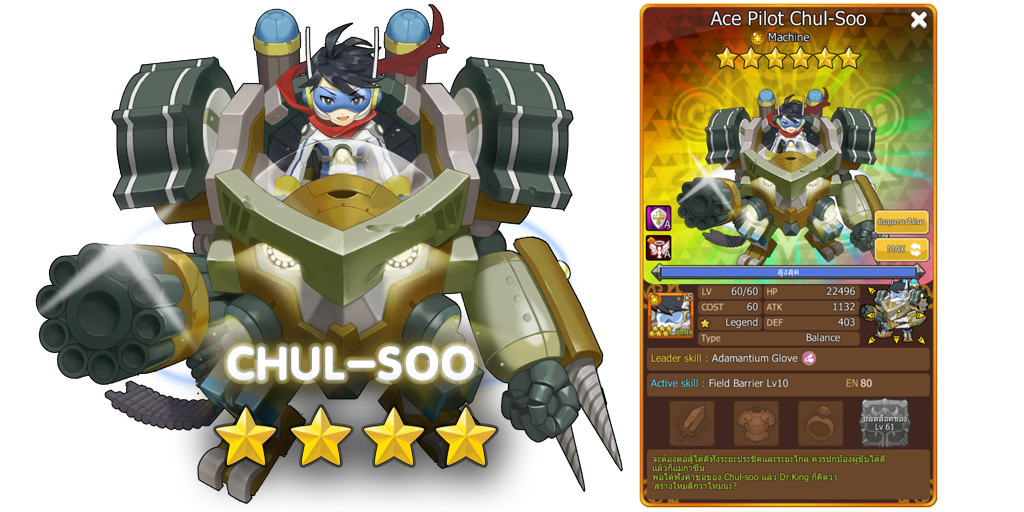 Leader Skill (6 ดาว) : High-Tech Bullet-Proof Jacket - ฟื้นฟู HP จำนวน 2,000 หน่วย ให้กับ Creatures ฝ่ายเราทุกๆ เทิร์น / เพิ่ม Max HP ของ Creature เผ่า Machine อีก 3000 หน่วย