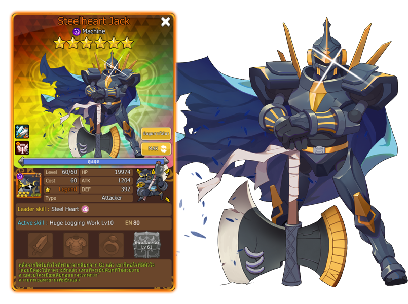 Leader Skill (6 ดาว) : Steel Heart - เพิ่มความเสียหายที่เกิดจาก Creature ฝ่ายเราทั้งหมดอีก 1.5 เท่า เมื่อโจมตีต่อเนื่อง 5 คอมโบ / เพิ่ม Max HP ของ Creature เผ่า Machine อีก 3000 หน่วย