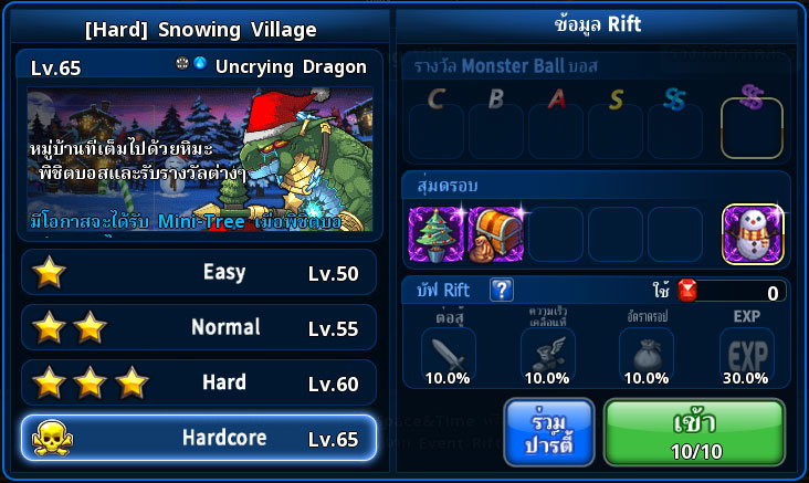 - เมื่อเอาชนะดันเจี้ยน Snowing Village ไม่ว่าจะเป็นระดับใด จะมีโอกาสได้กล่องสมบัติ Snowling Village's Random ซึ่งมีโอกาสเปิดเจอชุดเกราะขอบเขียวระดับ SSR ส่วนเสื้อ "Santa Top" และส่วนกางเกง "Santa Bottom