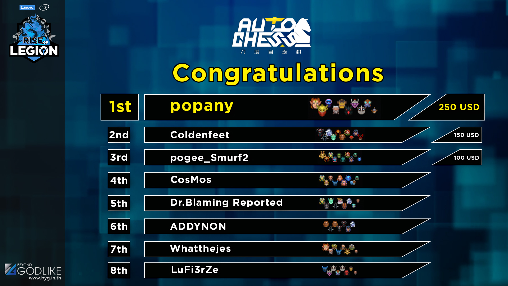 ในวันที่ 15 มีนาคม 2562 ที่ผ่านมา ทาง Rise of Legion ได้จัดการแข่งขันเกมอาเขตที่กำลังได้รับความนิยมไปทั่วโลกได้แก่ Auto Chess เกม อาเขต จากเกม Dota2 ซึ่งเป็นเกมแนว TD (Tower Defend) ซึ่งเราได้รับผู้สมัครเข้าแข่งขันทั้งหมด 128 คน !! จัดการแข่งขันตลอด 5 วัน ตั้งแต่วันที่ 11-15 มีนาคม 2562 และในที่สุดก็ได้ผู้ชนะได้แก่คุณ popany นั้นเอง