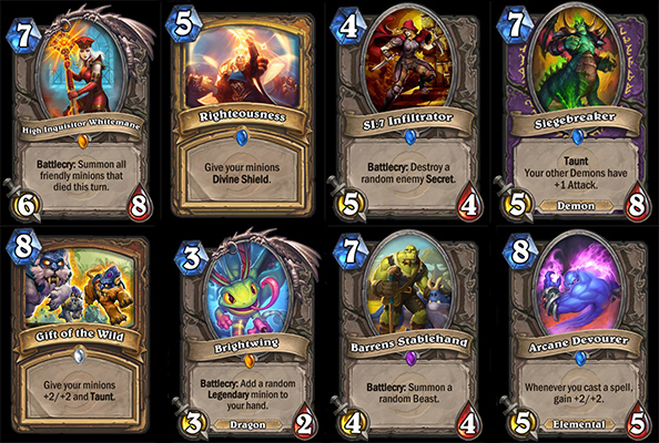 เมื่อตรวจสอบและกำหนดว่าแต่ละคลาสควรเป็นไปในทิศทางใด ก็พบกับการ์ดหลายใบที่ไม่สอดคลองกับเอกลักษณ์ประจำคลาสที่กำหนดไว้ ทีมงานจะยังคงปรับการ์ดพื้นฐานและการ์ดในชุดคลาสสิคตามความจำเป็นต่อไป แต่สำหรับการอัปเดตนี้ ทีมงานได้ตัดสินใจที่จะจัดการกับการ์ดสองใบ ได้แก่ ระเบิดจิต (Mind Blast) และหายตัว (Vanish) จะถูกย้ายไปยังหอเกียรติยศและจะแทนที่การ์ดทั้งสองใบนี้ด้วยการ์ดที่มีความสามารถเหมาะสมกับภาพลักษณ์หลักของคลาสมากกว่าเดิม