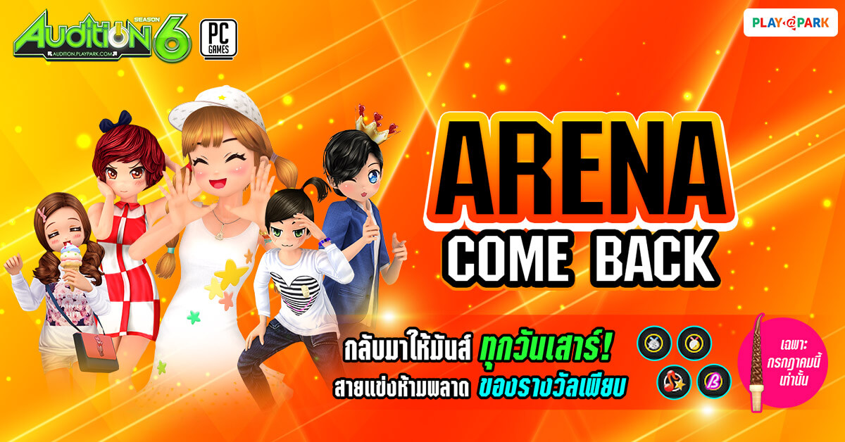 AUDITION เกมแดนซ์ออนไลน์สุดฮิตอันดับ 1 ของเมืองไทย จาก PlayPark.com กลับมาอีกครั้งกับการเปิดฟลอร์ Arena Channel ให้ขาแดนซ์ได้โชว์สเต็ปประลองฝีมือกัน ชิงรางวัลไอคอนพิเศษพร้อมคุณสมบัติ EXP x2 สามารถเข้าร่วมการแข่งขันได้ที่ Arena Channel เปิดทุกวันเสาร์ โดยแบ่งเป็น 4 รูปแบบการแข่งให้เลือกเข้าร่วมได้ดังนี้