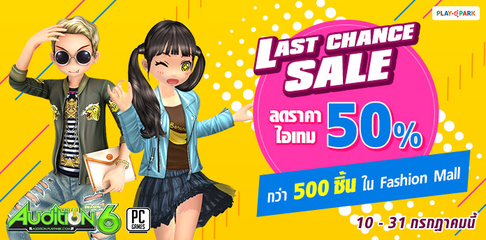 ปิดท้ายด้วยโปรโมชั่นสุดคุ้มที่ขาแดนซ์ทุกคนรอคอย LAST CHANCE SALE 2019 ลดราคาไอเทม 50% กว่า 500 ชิ้น โดยไอเทมที่นำมาลดราคาจะถูกนำออกจาก Shop หลังหมดโปรโมชั่น เริ่มแล้ววันนี้ – 31 กรกฎาคม 2562 ดูรายละเอียดไอเทมที่ลดราคาได้ที่ http://bit.ly/2YLJ3g4 นอกจากนี้ยังสามารถติดตามกิจกรรมอื่นๆ เพิ่มเติมได้ที่เว็บไซต์ AUDITION.PLAYPARK.COM หรือที่ Facebook Fanpage AUDITION THAILAND รับรองว่าไม่พลาดทุกกิจกรรมของ AUDITION แน่นอน!! เล่นง่าย เล่นฟรี ใช้ Facebook ID เล่นได้เลยทันที ไม่ต้องสมัคร! โหลดเลยแล้วมาแดนซ์มันส์ด้วยกัน!