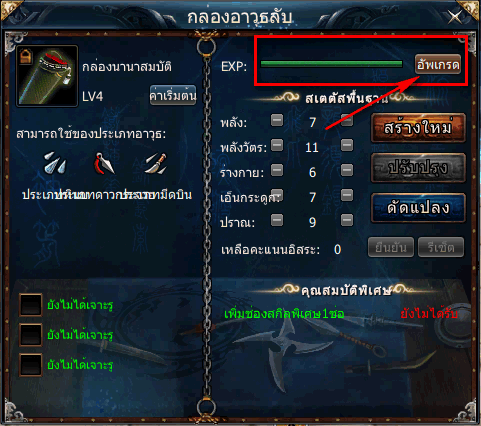 วิธีการอัพเกรด ทำการสวมใส่กล่องอาวุธลับที่ต้องการอัพเกรด จากนั้นคลิกขวาใช้งานไอเทมในกระเป๋า เมื่อหลอด EXP ของอาวุธลับเต็มแล้ว ก็สามารถกดปุ่มอัพเกรด เพื่อเลื่อนเลเวลของอาวุธลับได้เลย