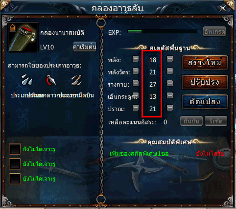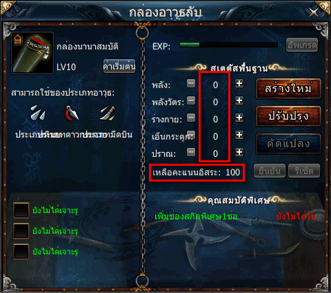 การปรับปรุงอาวุธลับ เมื่อทำการอัพเกรดอาวุธลับครบทุกๆ 10 เลเวล จะสามารถปรับปรุงอาวุธลับ เพื่อรีเซ็ตค่า Status ของอาวุธลับ เพื่ออัพใหม่ได้เองตามต้องการ เช่น เมื่ออัพเกรดอาวุธลับถึงเลเวล 10 แล้ว ค่า Status จะสุ่มมาให้ทั้งหมด จากนั้นให้ทำการกดปุ่มปรับปรุง โดยจะทำการปรับปรุงได้ต้องมีไอเทม “คัมภีร์โบราณ” จำนวน 1 ชิ้น ต่อการดัดแปลง 1 ครั้ง ซึ่งสามารถซื้อได้จาก Item Mall ภายในเกม เมื่อทำการดัดแปลงเสร็จแล้วค่า Status จะถูกรีเซ็ตใหม่ และเป็นคะแนนอิสระเพื่อให้ผู้เล่นอัพค่า Status เองตามต้องการ