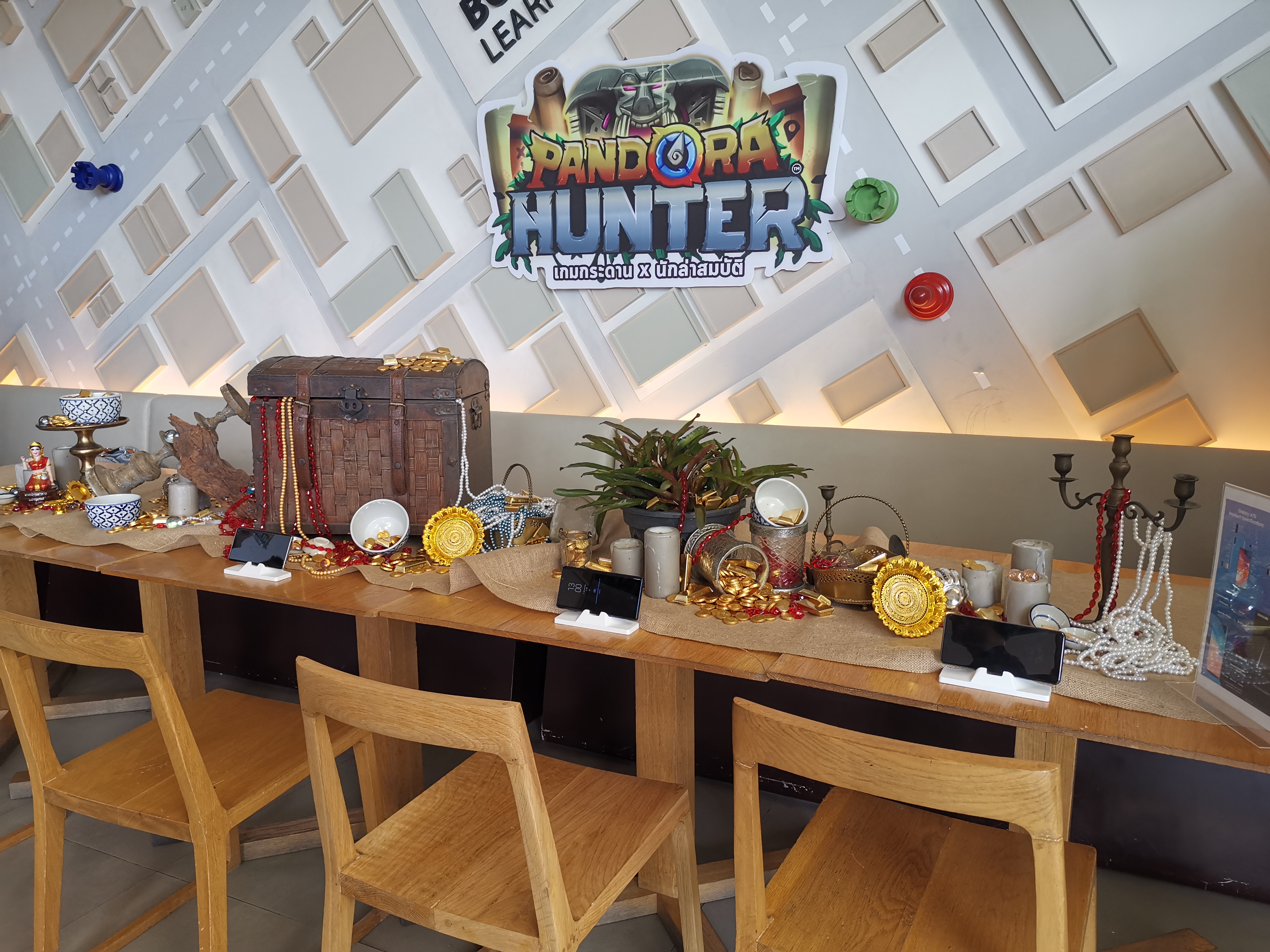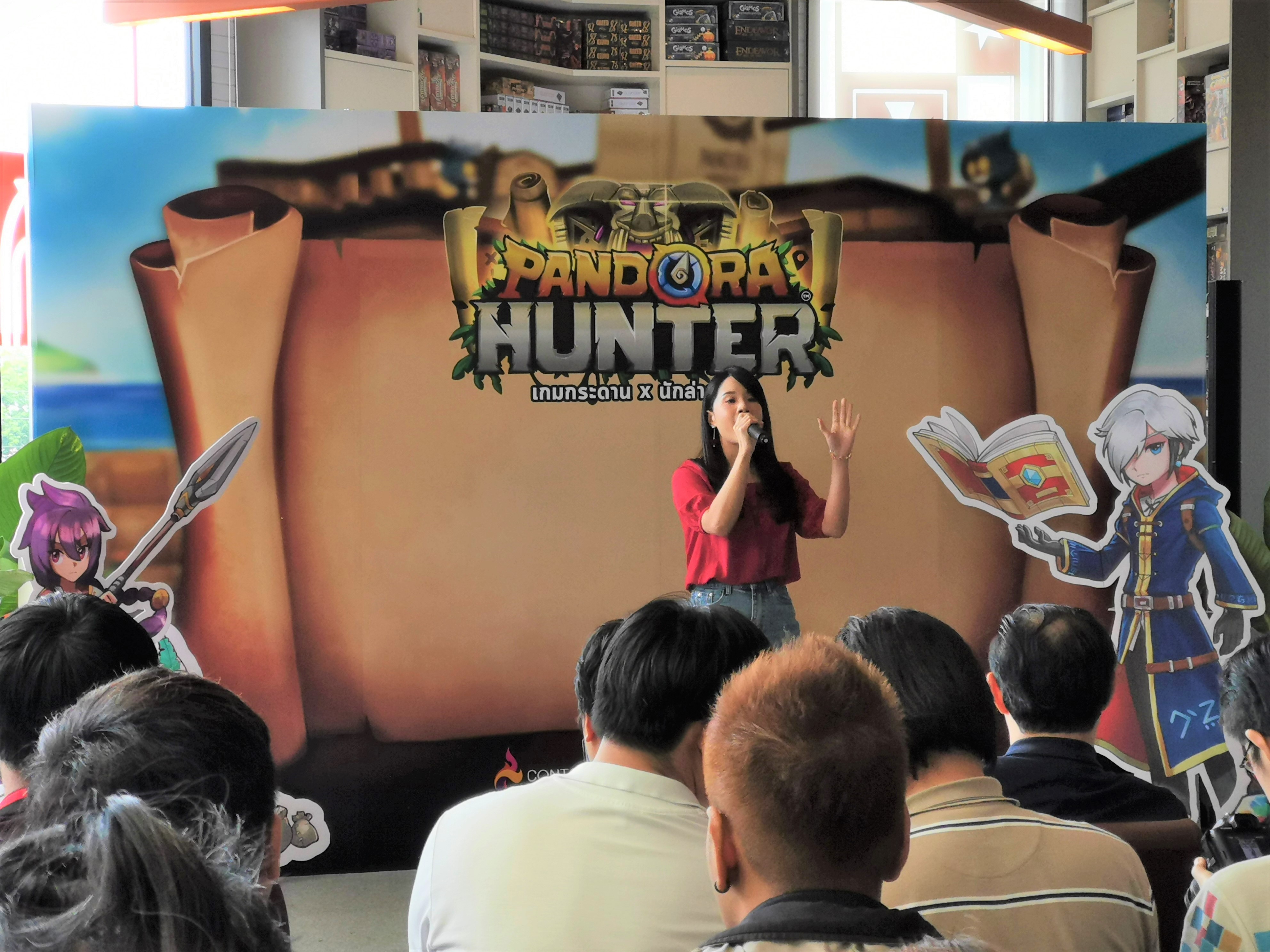 งานเปิดตัวเกม Pandora Hunter ในครั้งนี้ จัดขึ้น ณ More Than a Game Café ที่ I’m Park Chula บรรยากาศภายในงานเต็มไปด้วยความครึกครื่น ทั้งสื่อและอินฟลูเอนเซอร์ในวงการเกมต่างตบเท้าเข้าร่วมงานกันอย่างเนืองแน่นตั้งแต่เวลาบ่ายโมง ภายในงานมีการจัดแต่งสถานที่ในธีมของเกม Pandora Hunter ที่นอกจากสแตนดี้ตัวละครแล้ว ยังมีกองสมบัติมหาศาลตั้งเรียงรายอยู่เต็มไปหมด ที่สำคัญ! มีเกม Pandora Hunter ให้ผู้เข้าร่วมงานได้ทดลองเล่นก่อนใครด้วย และไม่ต้องกลัวว่าจะเล่นไม่เป็น เพราะในงานมีสตาฟหนุ่มคอยให้คำแนะนำตลอดการเล่นอย่างใกล้ชิด