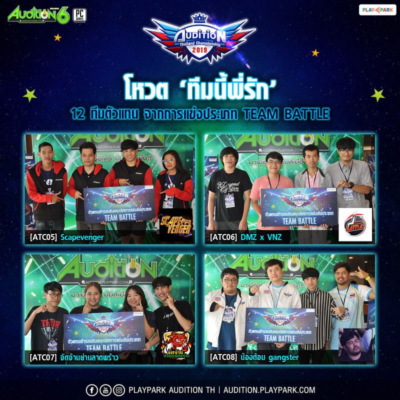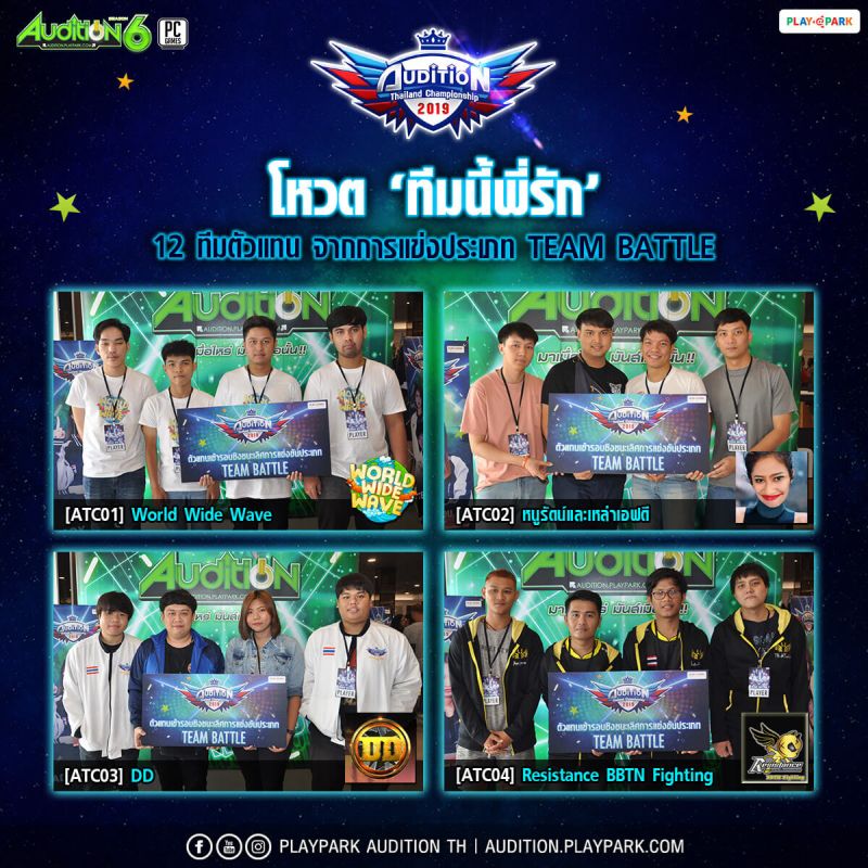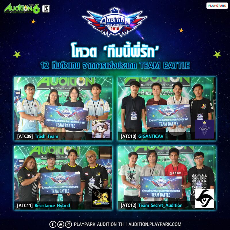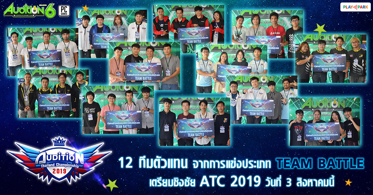 AUDITION เกมแดนซ์ออนไลน์สุดฮิตอันดับ 1 ของเมืองไทย จาก PlayPark.com เข้าสู่โค้งสุดท้ายแล้วกับการแข่งขัน AUDITION THAILAND CHAMPIONSHIP 2019 โดยเมื่อวันที่ 20 และ 21 กรกฎาคมที่ผ่านมา เป็นการแข่งขันรอบคัดเลือกประเภท TEAM BATTLE ณ สนามแข่งขันร้าน LODESTAR (รามคำแหง 53) ไปดูกันดีกว่าว่า 12 ทีมสุดท้ายที่ได้ผ่านเข้าสู่รอบชิงชนะเลิศจะเป็นทีมใดกันบ้าง