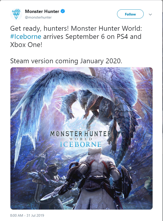 Twitter อย่างเป็นทางการของเกม Monster Hunter ได้ออกมายืนยันแล้วว่า Monster Hunter World: Iceborne กำลังจะมาในวันที่ 6 กันยายนนี้ บนเครื่อง PS4 และ Xbox One แน่นอน! และยังบอกอีกว่าเวอร์ชั่น Steam จะมาในเดือนมกราคม 2020 ที่จะถึงนี้ ห่างจากเวอร์ชั่นคอนโซลประมาณ 4 เดือน ก็ถือว่าไม่นานมาก เพราะวันวางจำหน่ายภาคหลักของ Monster Hunter World บน PC ก็ห่างจากวันวางจำหน่ายบนคอนโซลถึง 8 เดือน ครั้งนี้ถือว่าเร็วขึ้นพอสมควร