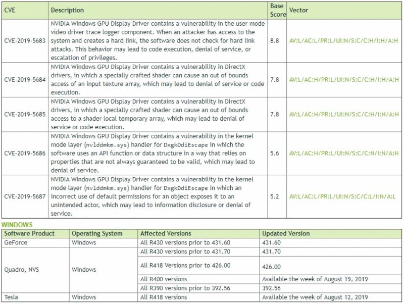 Nvidia ประกาศถึงผู้ใช้งาน โดยแนะนำให้อัปเดตไดร์เวอร์เพื่อแก้ปัญหาและป้องกันช่องโหว่ในด้านความปลอดภัยล่าสุด ทั้งการ์ดในตระกูล Geforce,Quadro,Tesla ปัญหาทั้งหมดจะได้รับการแก้ใขในไดร์เวอร์ล่าสุด 431.60 รายละเอียดและรหัสไดร์เวอร์ของแต่ละรุ่นในผลิตภัณฑ์ของ Nvidia มีรายละเอียดคร่าวๆ ดังต่อไปนี้