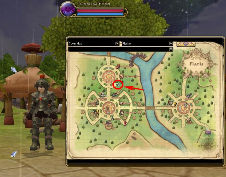 ก่อนอื่นให้เราวิ่งไปหา NPC ที่ชื่อว่า “Forsaken Tower Manager” ซึ่งจะอยู่ที่เมือง Flaris ใกล้กับที่ลงวอร์ หรือกด M เพื่อดูแผนที่และวิ่งไปหาจุดวงกลมสีแดงได้เลย