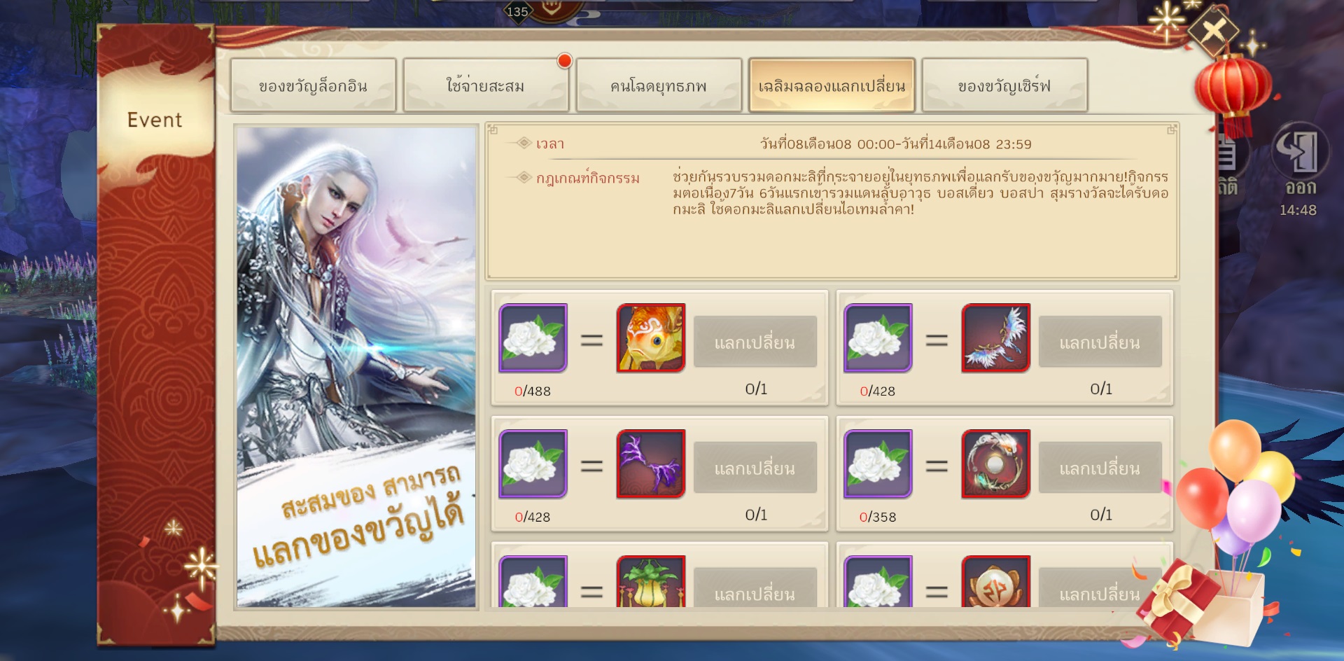 วันที่ 14 สิงหาคม นำดอกมะลิไปแลกเปลี่ยนไอเทมได้เท่านั้น