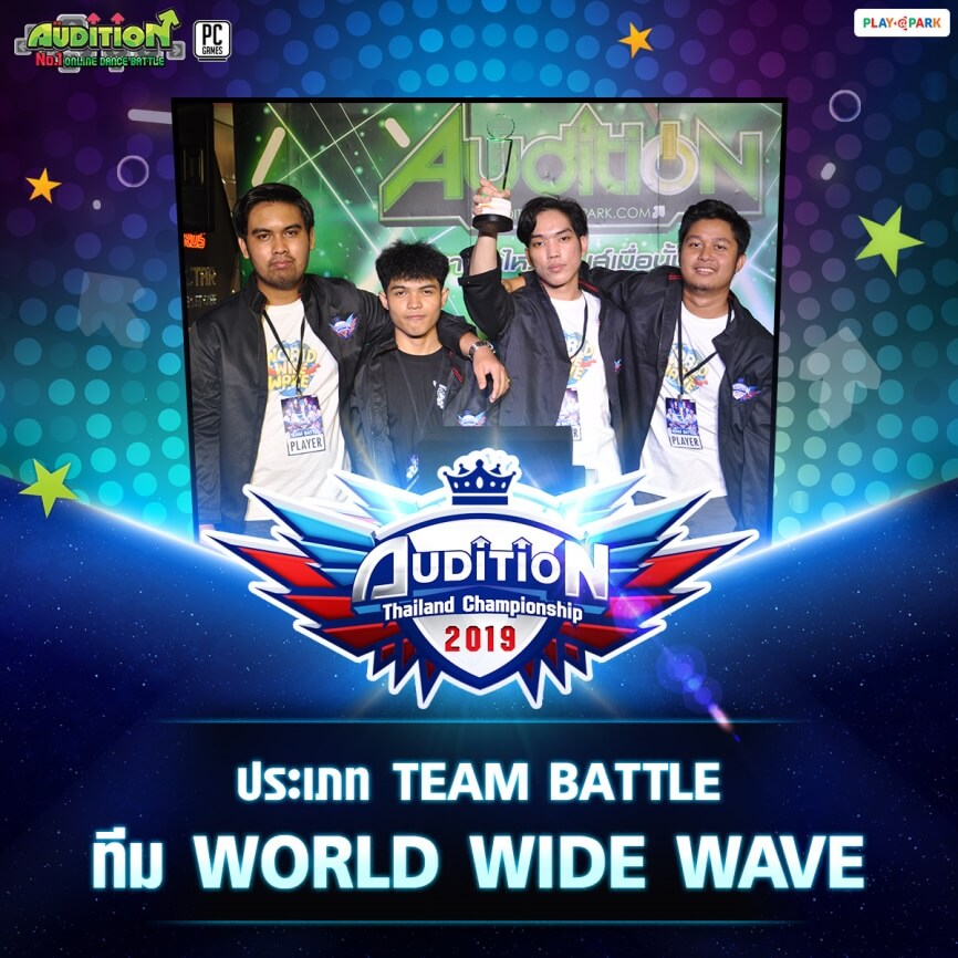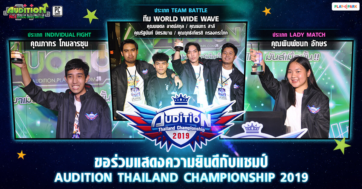 ต้องขอแสดงความยินดีกับผู้ชนะการแข่งขันทุกประเภท ที่มีความ #กล้าที่จะแกร่ง #กล้าที่จะเกิด จนสามารถคว้าแชมป์ AUDITION THAILAND CHAMPIONSHIP 2019 ในปีนี้ไปครองได้สำเร็จตามที่ตั้งใจไว้ และฝากร่วมส่งแรงใจเชียร์ ทีม WORLD WIDE WAVE ที่ได้รับสิทธิ์เป็นตัวแทนทีมไทยไปแข่งขันต่อในรายการ AUDITION SOUTHEAST ASIA CHAMPIONSHIP 2019 ที่ประเทศฟิลิปปินส์ สามารถติดตามข่าวสารและกิจกรรมอื่นๆ ที่น่าสนใจเพิ่มเติมได้ที่ AUDITION.PLAYPARK.COM หรือที่ Facebook Fanpage AUDITION THAILAND รับรองว่าไม่พลาดทุกกิจกรรมของ AUDITION แน่นอน!! เล่นง่าย เล่นฟรี ใช้ Facebook ID เล่นได้เลยทันที ไม่ต้องสมัคร!! โหลดเลยแล้วมาแดนซ์มันส์ด้วยกัน!!