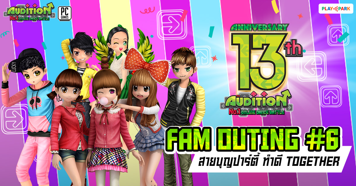 AUDITION เกมแดนซ์ออนไลน์สุดฮิตอันดับ 1 ของเมืองไทย จาก PlayPark.com ฉลองครบรอบ 13 ปี AUDITION ชวนขาแดนซ์ร่วมกิจกรรม FAM Outing สายบุญปาร์ตี้ ทำดี TOGETHER ซึ่งครั้งนี้จัดขึ้นเป็นครั้งที่ 6 แล้ว เป็นกิจกรรมที่ AUDITION จะพาเหล่าขาแดนซ์พักนิ้วแล้วออกไปทำกิจกรรมร่วมกันนอกสถานที่ ซึ่งนอกจากจะได้รับความสนุกสานสัมพันธ์ FAM แล้ว ยังได้ทำความดีร่วมกันและได้ไอเทมติดไม้ติดมือกลับบ้านกันไปเลยทุกคน