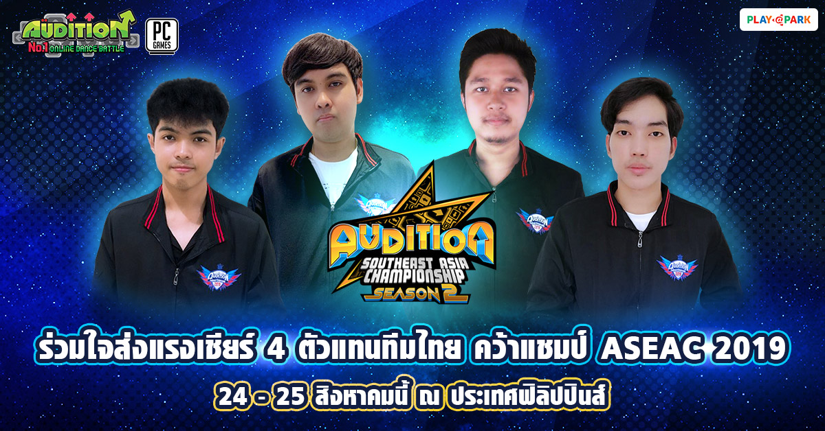 AUDITION เกมแดนซ์ออนไลน์สุดฮิตอันดับ 1 ของเมืองไทย จาก PlayPark.com ขอชวนขาแดนซ์ชาวออดิชั่นร่วมส่งแรงใจเชียร์ ทีม WORLD WIDE WAVE ที่ได้เป็นตัวแทนทีมไทยไปแข่งขันเกม AUDITION ในรายการ AUDITION SOUTHEAST ASIA CHAMPIONSHIP 2019 โดยสมาชิกในทีมประกอบด้วย คุณนพดล อาตม์สกุล, คุณธนกร สาลี, คุณรัฐนันท์ มิตรสมาน และคุณฤทธิเกียรติ กรองกระโทก โดยทีม WORLD WIDE WAVE จะต้องไปชิงชัยกับอีก 3 ประเทศที่เข้าร่วมการแข่งขัน ได้แก่ ฟิลิปปินส์, มาเลเซีย และสิงคโปร์ ในวันที่ 24 – 25 สิงหาคม 2562 ที่ประเทศฟิลิปปินส์